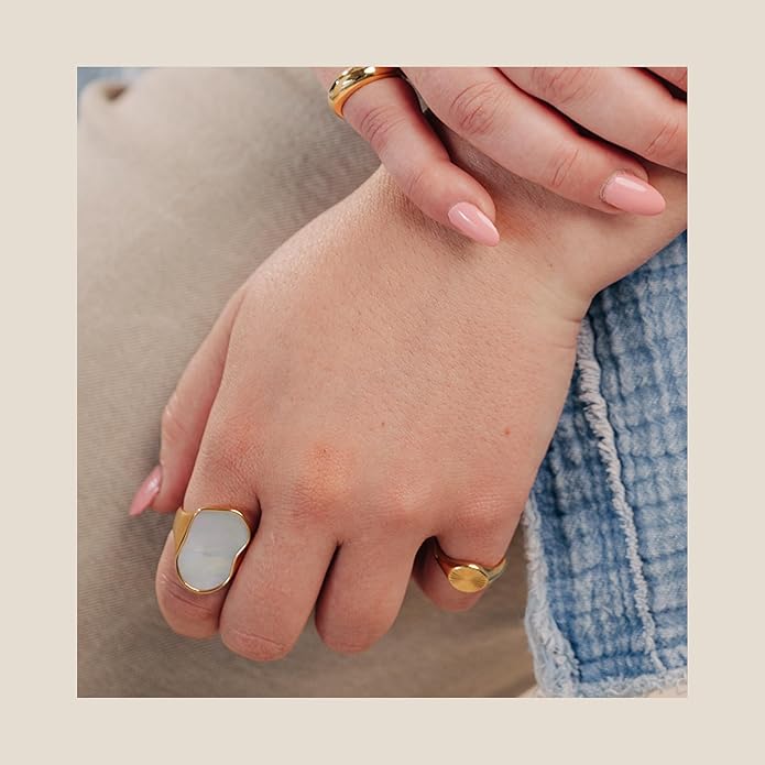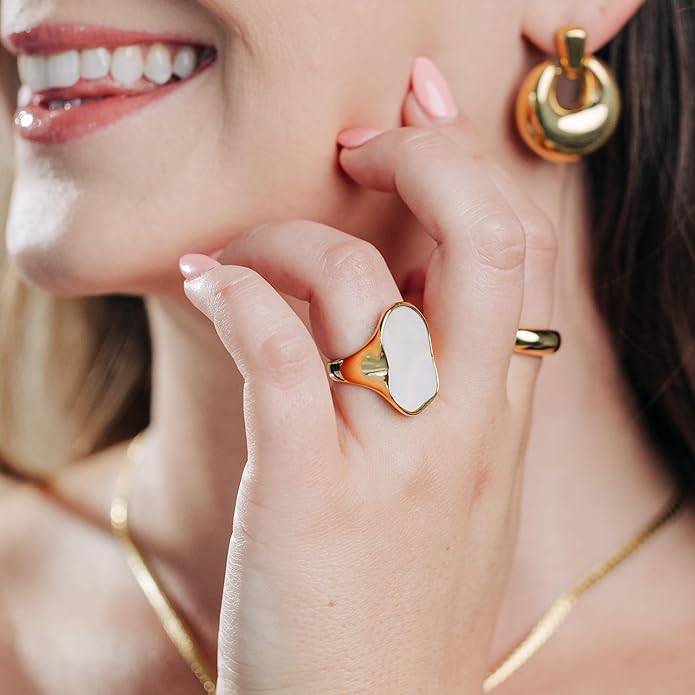 Featuring a luminous Mother of Pearl gemstone, this 18k gold-plated statement ring captures timeless elegance and one-of-a-kind beauty.